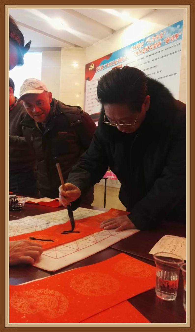 2018年2月5日,立春后第一天,时令虽然进入"六九"而清晨却寒冷异常,零下5度。带着厚厚的皮手套,手指仍感到冻得有点疼。即使如此,湖北省书画家协会东湖书画院的院士一行11人,在院长袁文涛的带领下走进武昌百瑞景社区开展为居民送福送春联活动。